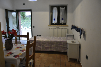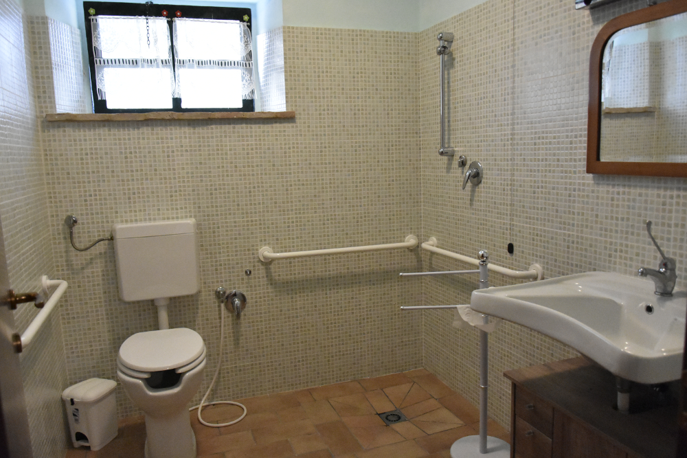 Al piano inferiore, attrezzata per invalidi con 2 posti letto, Camera (matrimoniale/doppia) con: finestra, tv,tavolo, guardaroba, piccolo angolo per preparare i cibi (incluso frigo e spazio per preparazione), riscaldamento centralizzato. Bagno con: finestra, doccia,Wc/ Doccia per disabili, No bidet, Asciugacapelli, Scalda- salviette. Cambio asciugamani supplementare a pagamento.